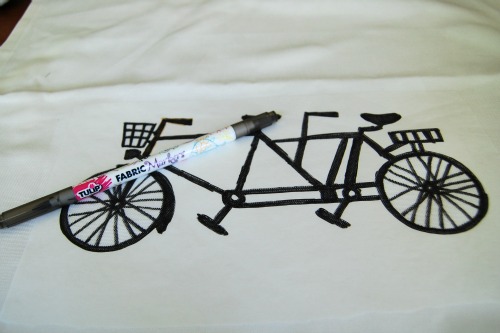 I started with a blank pillow cover which I found at Ikea. It was a few dollars and it has a nice zipper in it which is great for washing. I created a freezer paper stencil of a bike. (If you've never tried freezer paper stenciling I have a how to video HERE.) You cut the paper and then iron it onto the fabric to seal it on. I usually use paint with these stencils, but I thought I'd go for fabric markers this time around.