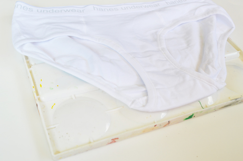 Wet your undies before you start. I placed my pair on an old painting palette. I actually flipped it over and used the underneath because it has an edge around it to hold all of the liquid. Plus it's plastic which makes it easy to clean.