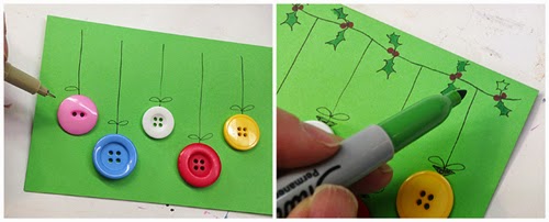 Glue colorful buttons to the green card to create ornaments. Draw a line from each button up to the top of the card, stop about 1/2” from the crease. Draw a little bow onto the “string” and draw a little square at the top of the button to complete the ornament. Draw a line across the top of the card for all the ornaments to hang from. You can also draw holly berries and leaves and color them in.