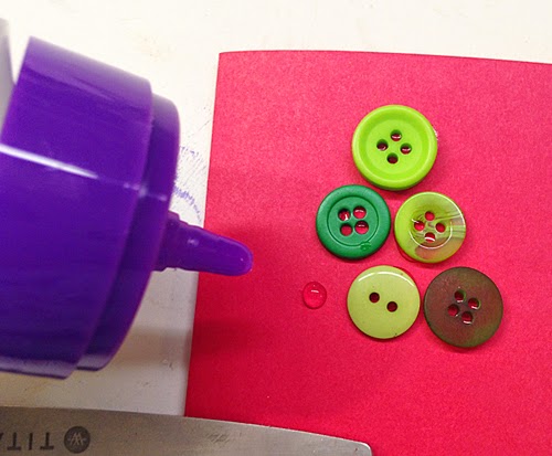 Glue green buttons in the shape of a pine tree onto the red card. Glue a brown button to the bottom for the trunk. Tie a piece of ribbon into a bow and trim the ends. Glue the bow to the top of the tree.